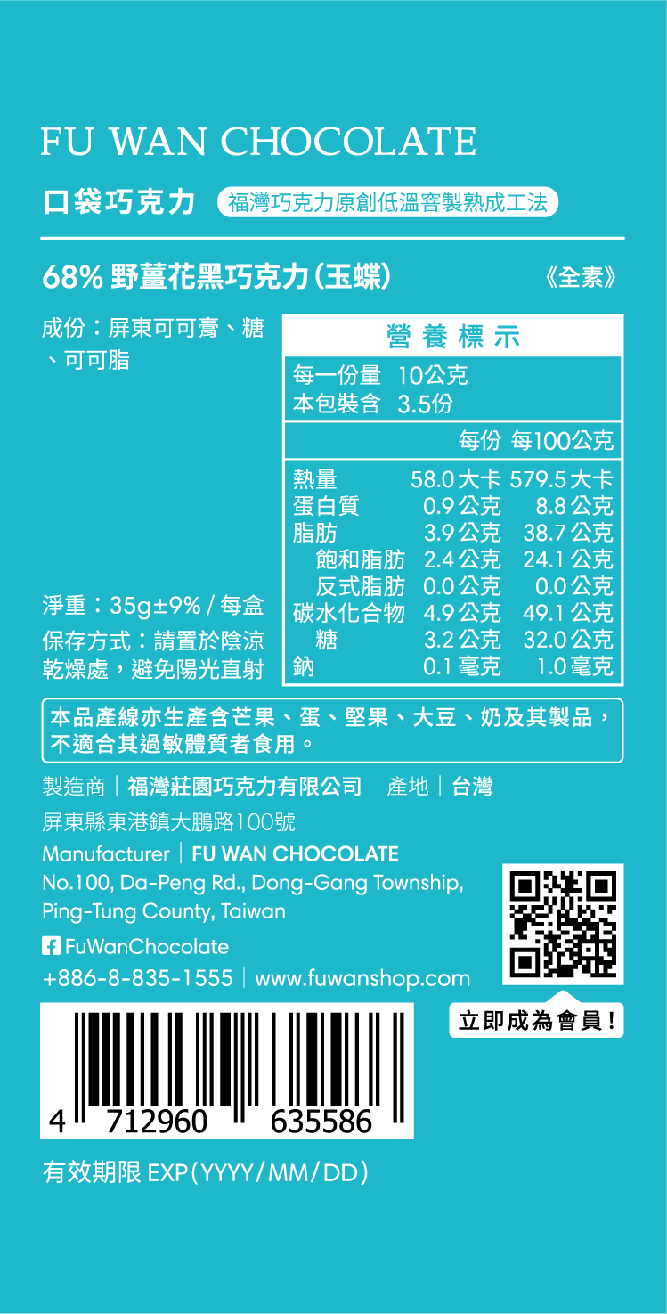 福灣巧克力2021四季巧克力計畫中的壓軸作品 – 玉蝶,是以68%黑巧克力為基礎、並帶有清新野薑花香氣的創作巧克力。 台灣山林小鎮中常見野薑花蹤跡,形似白色蝴蝶駐足於筆直莖稈上,不僅外貌討喜,清新秀雅香氣更是被廣泛利用於原鄉飲食以及香氛用品開發,是庄頭的 最佳親善大使。玉蝶巧克力採用的野薑花和夏季的月桃葉同樣來自森林覆蓋率100%的屏東縣牡丹鄉,福灣巧克力創辦人Warren對於牡丹鄉有著特殊的情感連結。「從小常聽媽媽述說她童年如何請山 親揹著來往於山間小路、各種趣聞逸事;時至今日,與身邊的太太、大小女兒及身為牡丹媳婦 的保母都與牡丹有著密不可分的因緣與故事!」 天地與緣分,似乎自有安排,Warren也因此 經常到牡丹出遊,深深為這片質樸、純淨的土地感動,希望讓更多人知道這裡的美及其珍貴之處。玉蝶巧克力的賦味手法,是以福灣巧克力原創工藝製程FIDARGS中的Scenting窖藏窨製工法 所完成。不同以往的是,野薑花的香氣分子實在過於細緻,乾燥過程中非常容易揮發散逸,因此嘗試各種可能性、經過一年多的實驗才找到最佳方式把野薑花細秀雅致的香氣完整保留於巧克力中。並且特地以68%這樣的甜度比例,讓野薑花的薑汁牛奶般的香氣更為自在流淌。期望野薑花的溫柔,能帶著每個靈魂回到心中那個最美好的湖畔。
