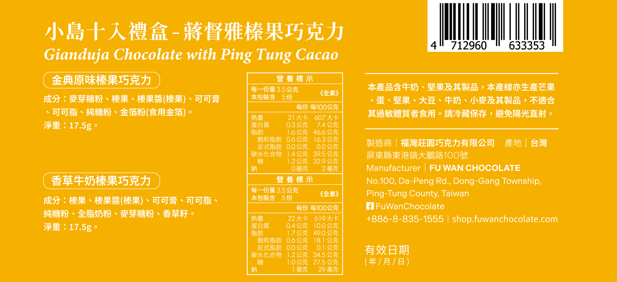 Gianduja,義大利巧克力之王,起源於杜林。福灣巧克力以屏東冠軍可可結合義大利 IGP 認證皮蒙特榛果,降低甜度、以可可島嶼形態呈現,製作出台義混血的蔣督雅可可島嶼巧克力。