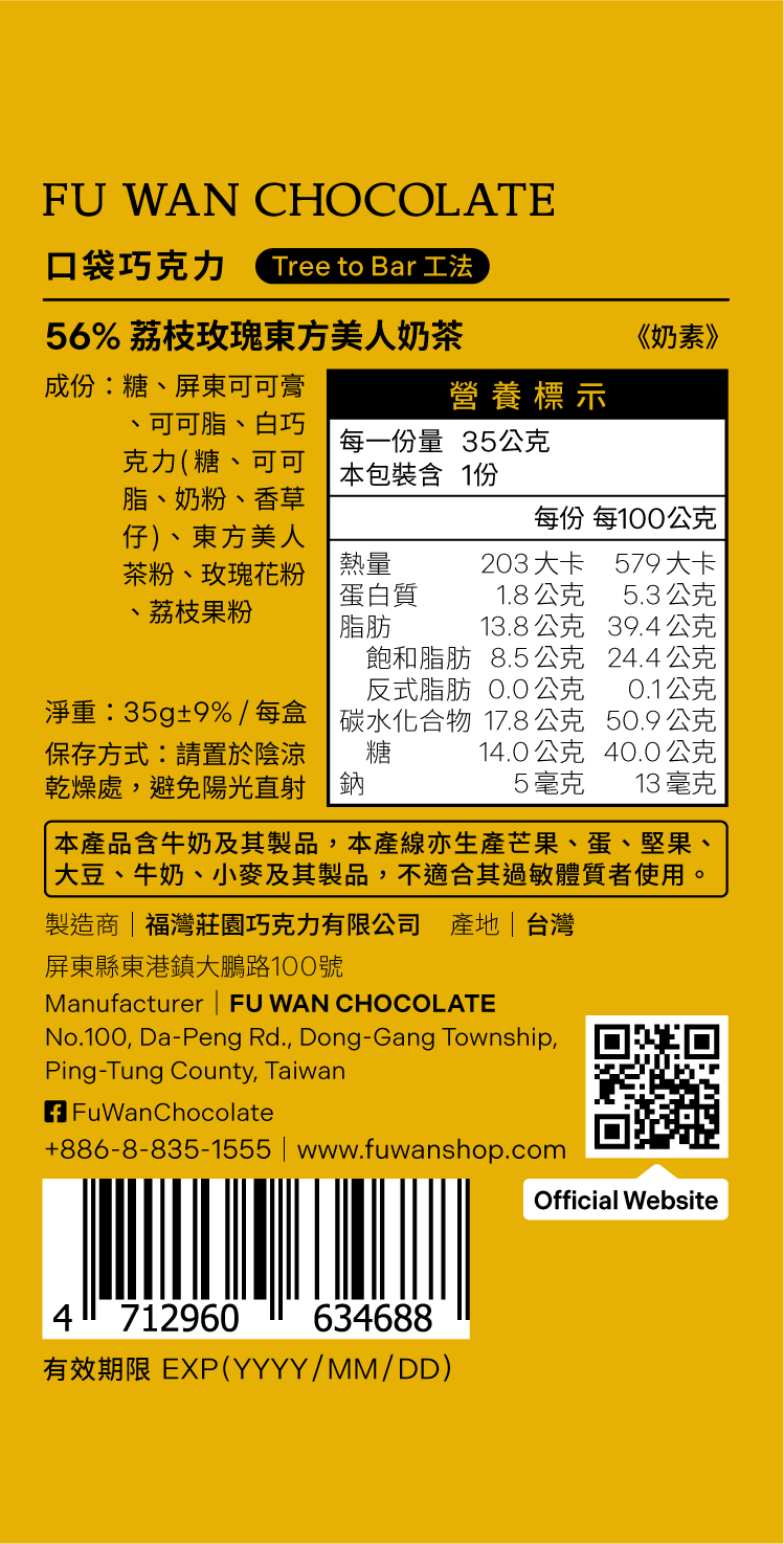 以台灣屏東巧克力為基底,融合東方美人高雅細膩的熟果花香, 並以玫瑰花粉與玉荷包荔枝粉作為點綴提香, 淡淡的奶香平衡茶與巧克力的澀感,帶出馥郁優雅的迷人調性。由於多種食材結合的複雜性與成品的平衡感,在世界大賽中得到了一個很特別的「食譜配方特別獎」。
