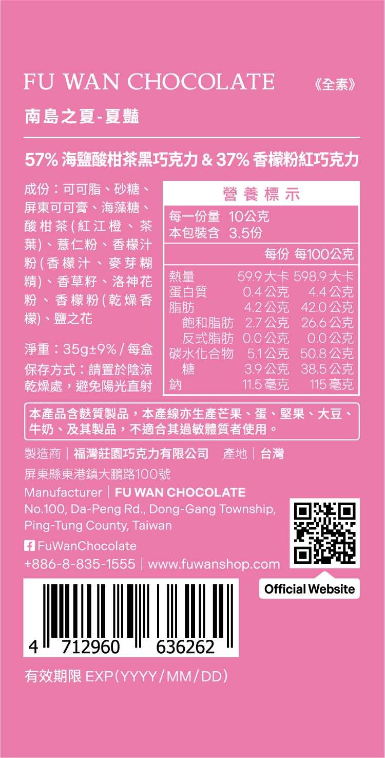 「南島之夏-夏艷」巧克力延續上一季的創作風格,同樣巧妙地將雙色巧克力融合為一,57%黑巧克力的部分以多次榮獲世界金牌的福灣茶巧克力系列基礎配方,將花蓮「Ba Han Han Non好茶咖啡工作室」的特製紅江橙酸柑茶研磨入巧克力中。主理人謝瑋翔不僅是農委會百大青農、「吉林茶園」祖傳四代金獎製茶師,同時也醉心於咖啡、酒、純露的鑽研,從農田的生機管理到產品研發製作全部一手包辦,和Warren對於土地的熱愛有著同樣的執著。阿翔的父親為客家人、母親為阿美族人,也因此學習到兩大族群的生活智慧並融會貫通於自家產品上。