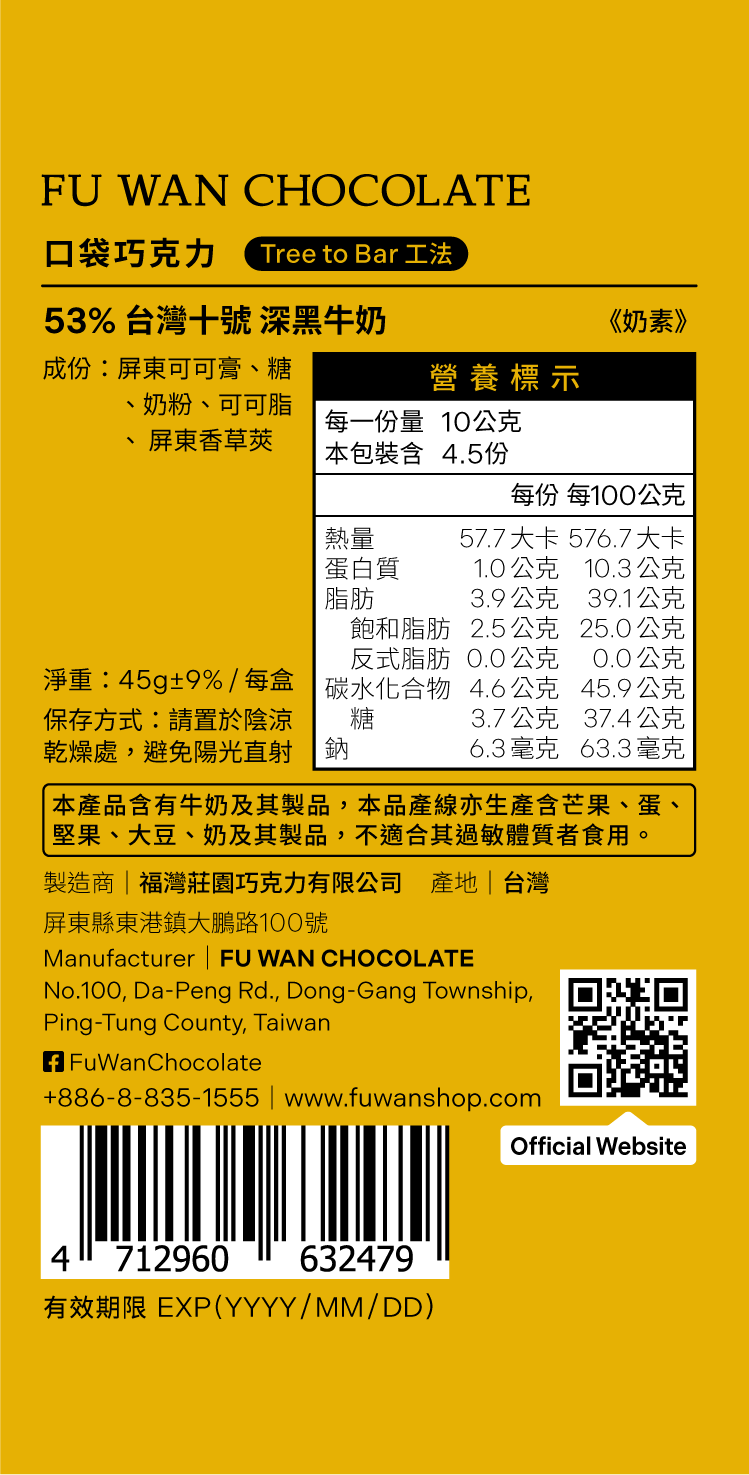 以略高的烘焙溫度帶出台灣可可強烈的堅果與甘草味,再加入低比例的奶粉使風味圓潤平衡,特別添加台灣本土香草,帶出乾淨的天然草本甜韻。